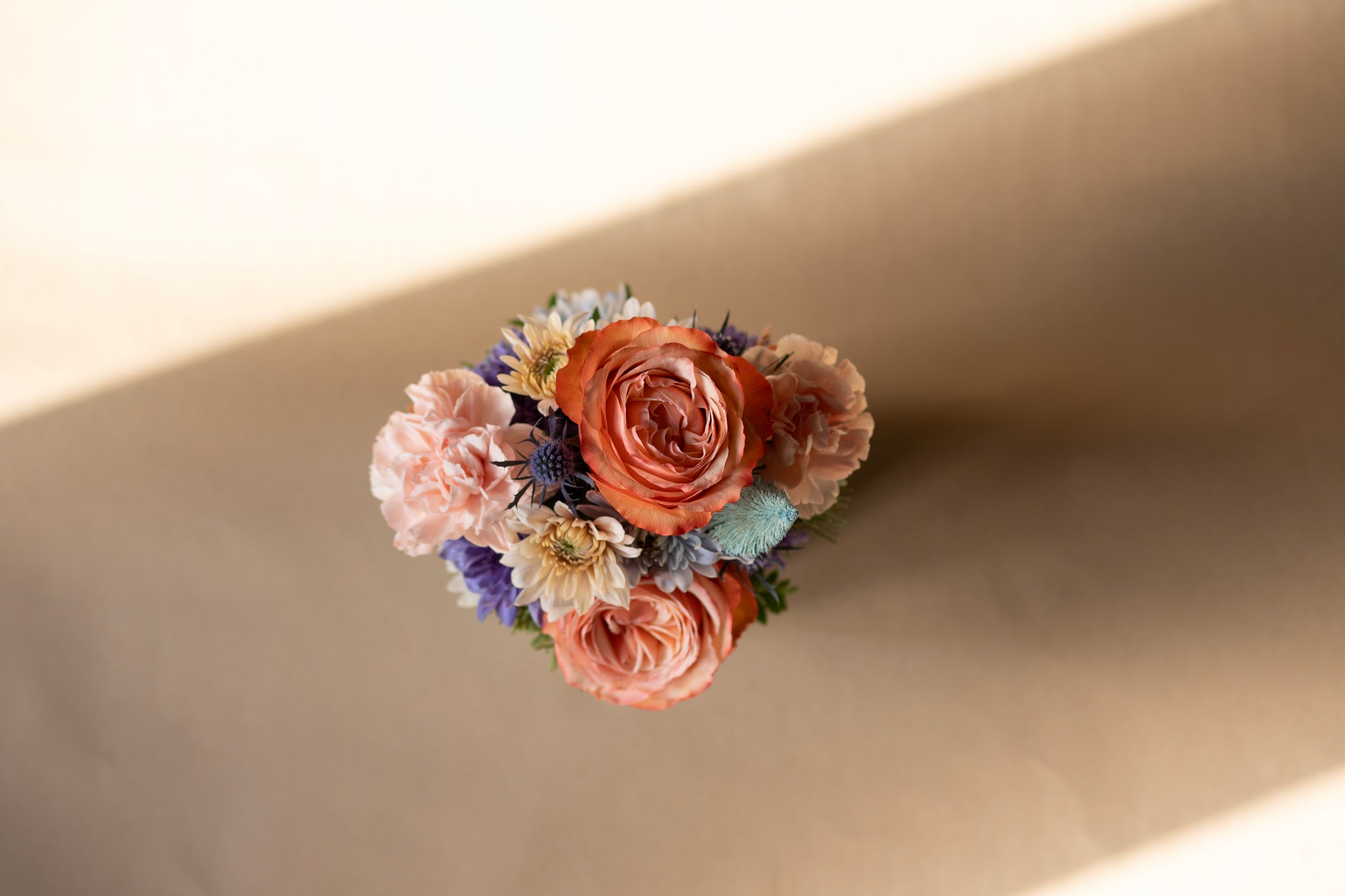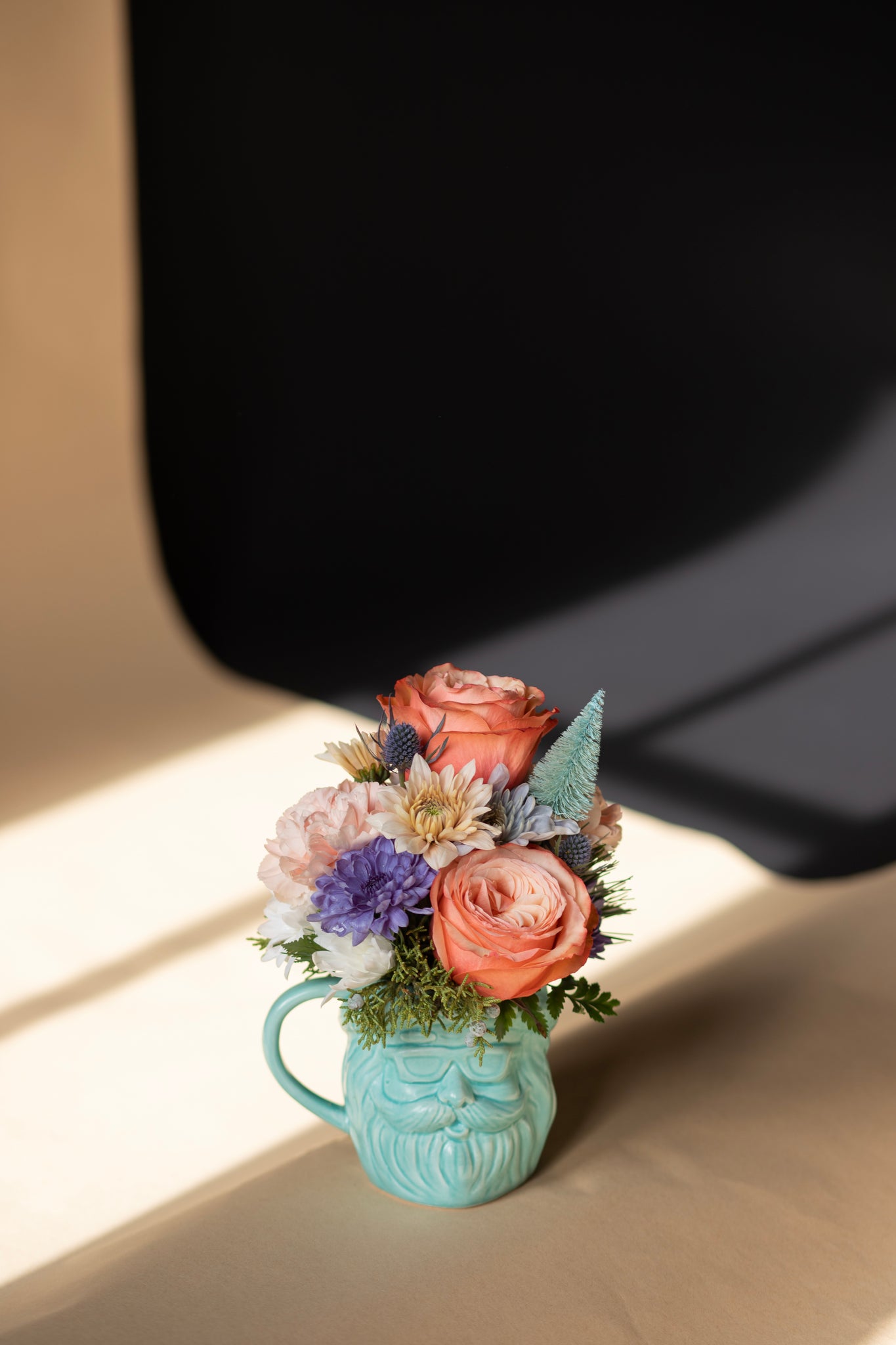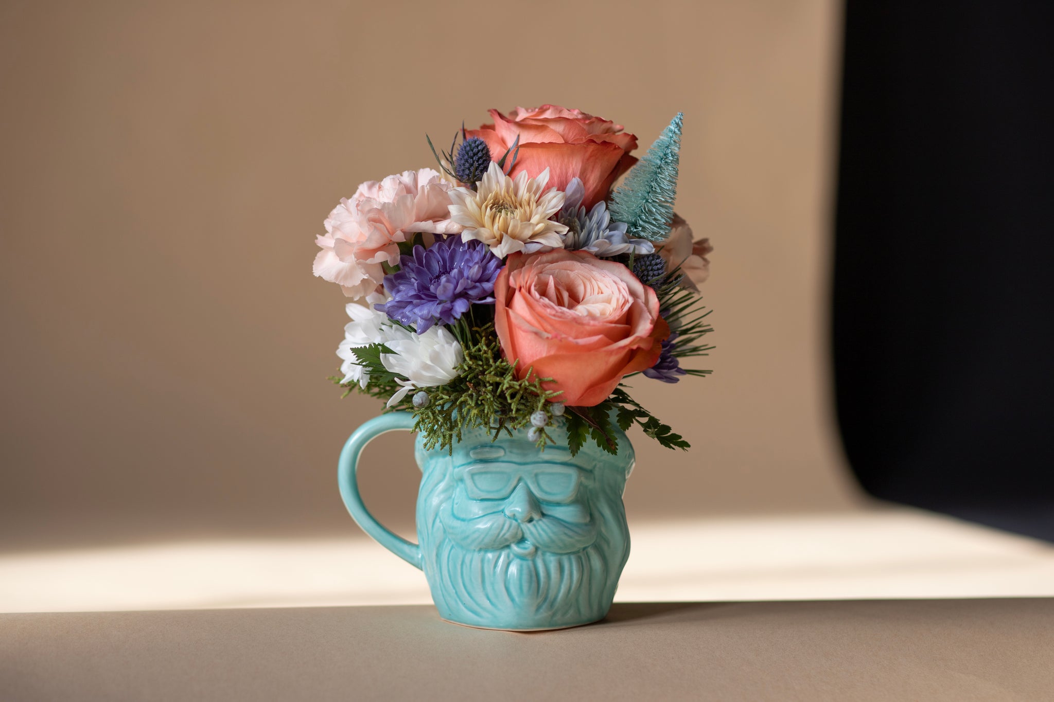 A trendy blue Santa mug full of festive blooms and accented with a cutie bottle brush tree to match