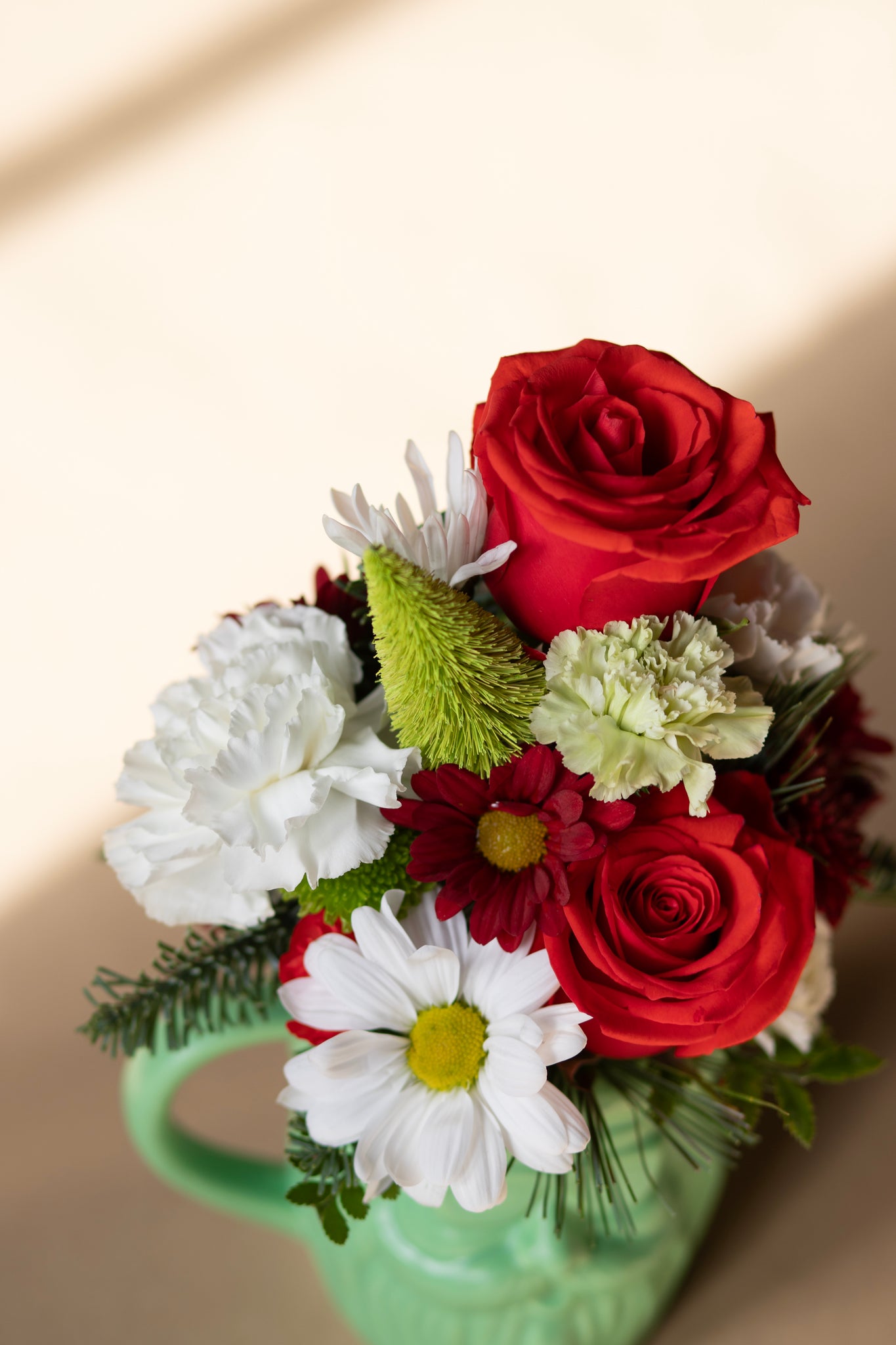 A trendy green Santa mug full of festive blooms and accented with a cutie bottle brush tree to match