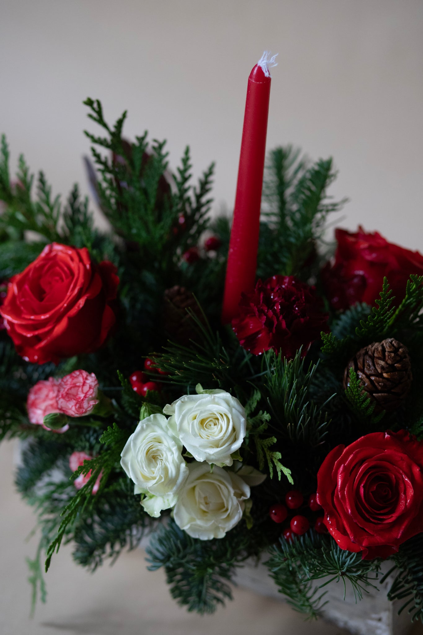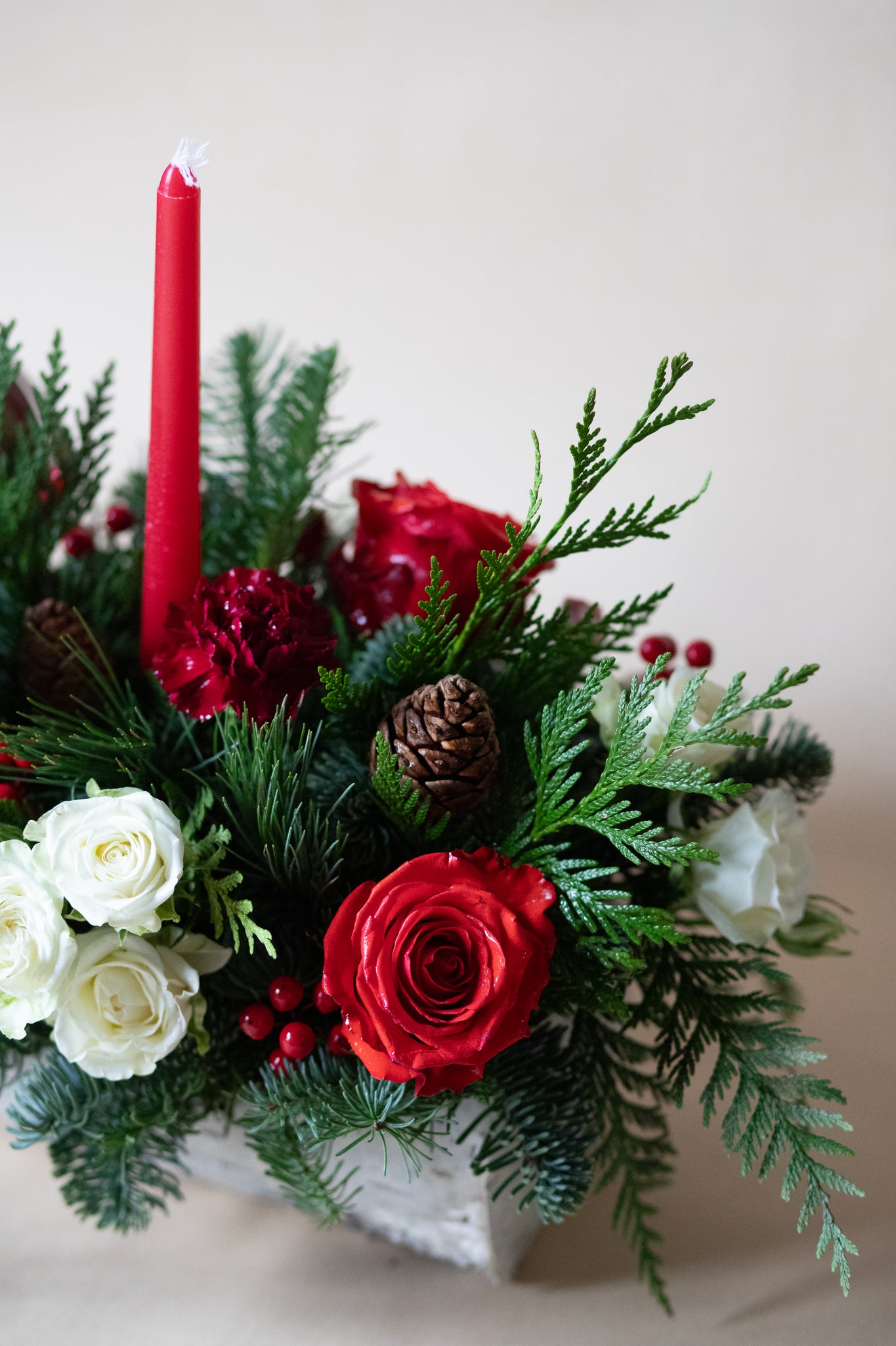Our popular Yule log full of Christmas greens, roses, cinnamon sticks, pine cones and more! Beautifully accented with a tall red taper candle.