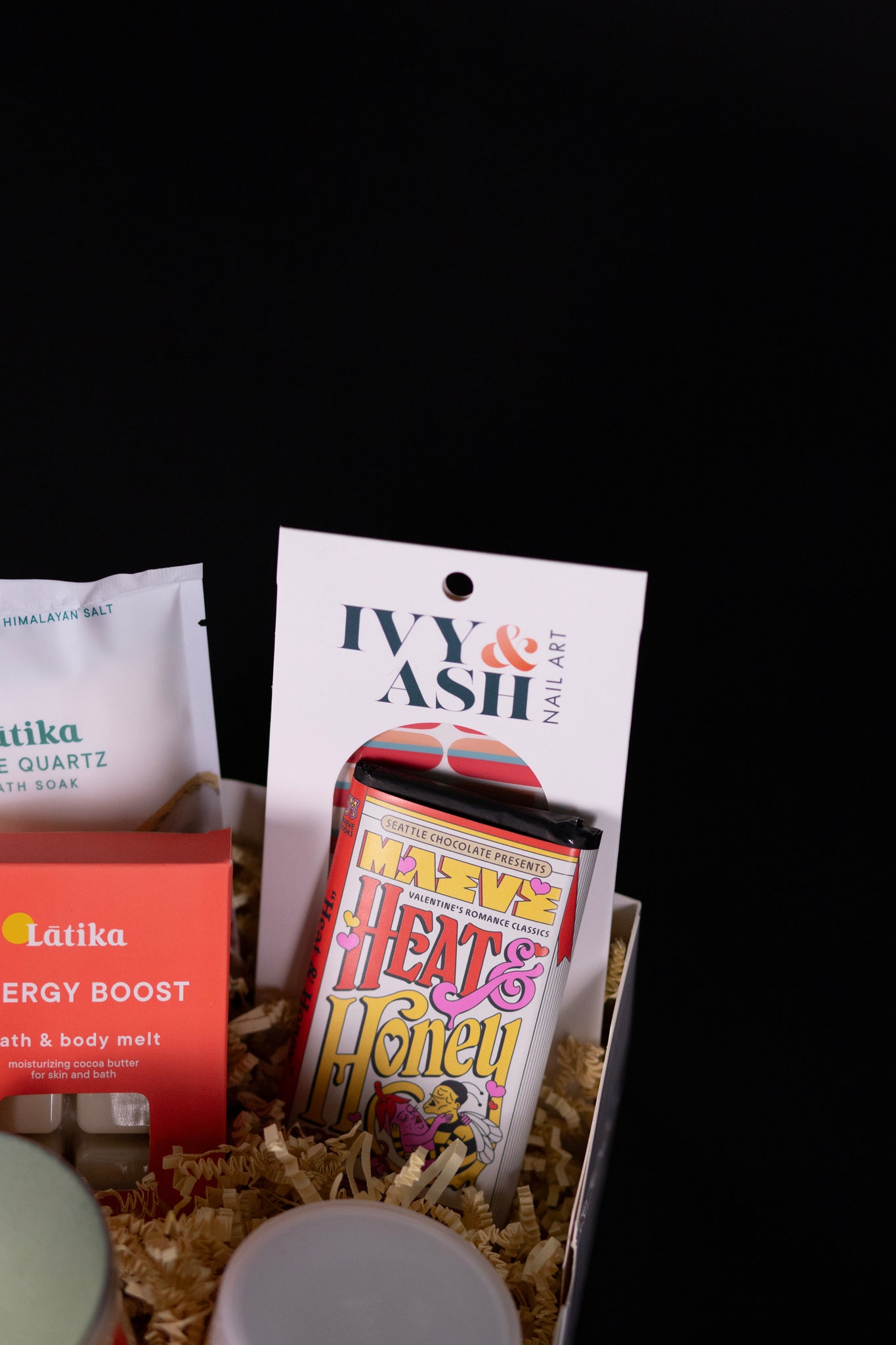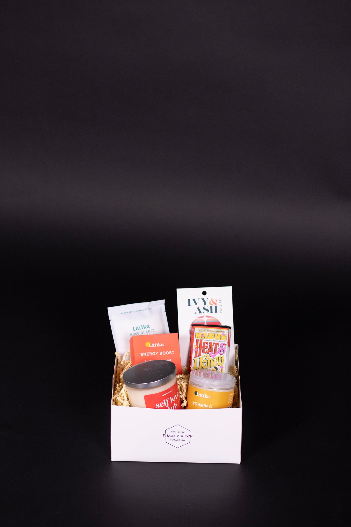 The Super Spa Box is filled with Spa Items that serve as a reminder that treating yourself comes with more than just flowers! This box holds a few of the shops favorite's with our Vitamin C Whip Scrub from Latika, a "Self Love Club" Candle from the Noteworthy Co, an Epsom/Himalayan Salt Bath Soak from Latika, a Moisturizing Cocoa Butter Bath and Body Melt also from Latika, a Sedona Sunset style self adhesive Manicure from Ivy & Ash, topped with a classic Heat and Honey Chocolate Bar from the Famous Seattle Chocolate's!